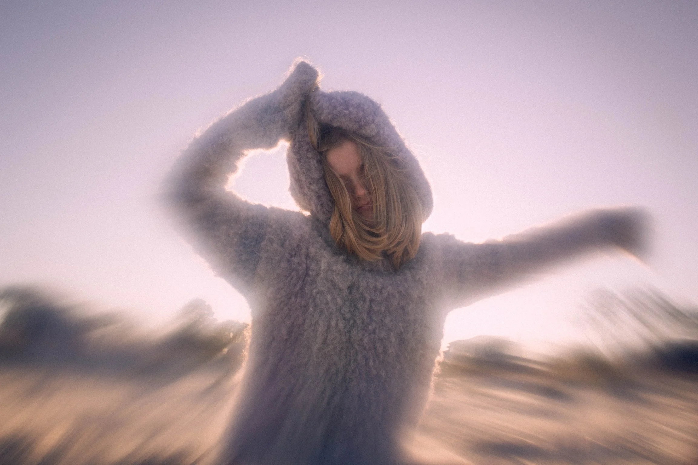 Ella Guy is a textile designer from the mountain town of Sun Valley, Idaho, specializing in knitwear and surface design for apparel. She draws inspiration from her journey of self-realization, creating tangible, multimedia fiber pieces that embody complex metaphors.